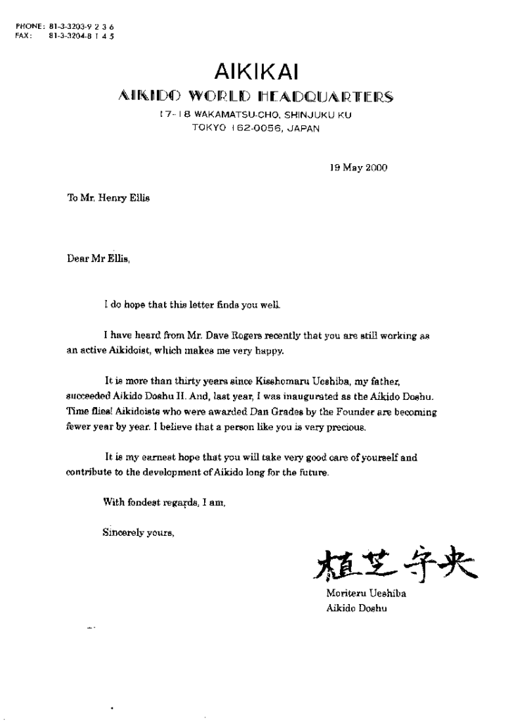 Je to už více než třicet let, co můj otec Kisshomaru Ueshiba stal II. Aikido Doshu. A v loňském roce jsem byl inaugurován do funkce Aikido Doshu.. Čas letí! Aikidistů, kterým zakladatel udělil stupně dan, je rok od roku méně. Věřím, že člověk jako vy je velmi cenný.